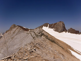 Desde aquí les doy la opción de hacer el siguiente pico por la arista y poco a poco les voy engañando para hacer un pico más y así hasta el Montferrat. El tramo así más delicado de la arista podría ser el primero hasta el Clot de la Hount, donde no es difícil pero es algo expuesto en un tramillo. El resto de la arista es sencilla con bastantes tramos aéreos. Seguimos entonces del pique Long al Pic du Clot de la Hount, luego al Cerbillona, después al Central y finalmente al Montferrat. La arista se puede continuar pero a estos ya no les engaño, y además este tramo no parece tan sencillo como los anteriores. Lo mejor de esta cima es que aparece Jorge que ha decidido hacerse 14 tresmiles en el día.