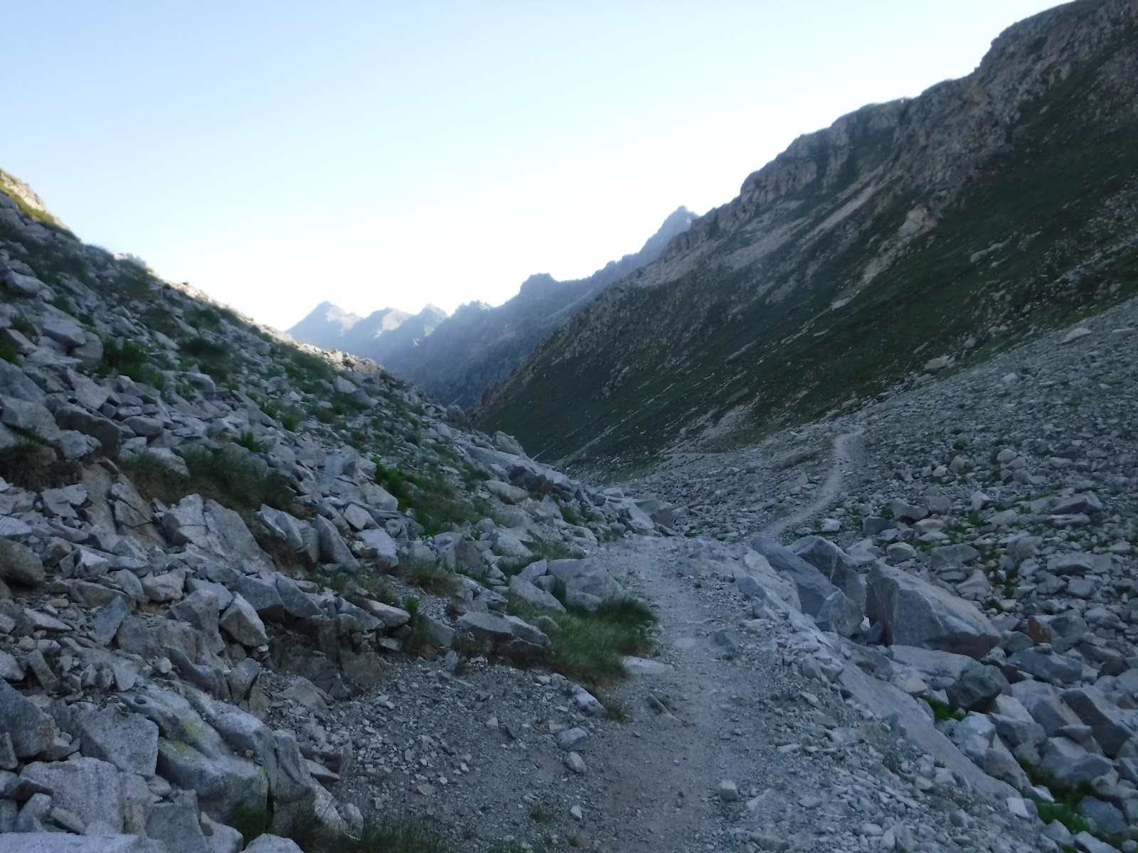 Salgó de la zona del Refugio de Larribet, afortunamente sin lluvias y con un clima templado, madrugando bastante porque no me gusta nada como estaba el cielo (al final no cayó gota). Pronto se llega a los Lacs de Batcrabere y aquí hay que estar más atento al sendero para no salirse. Mi idea inicial era ir hacia el Pass de la Barare pero visto que el camino que estaba marcado (hitos y marcas blancas y rojas) era el del Port Du Lavedan no lo pensé ni un segundo y seguir por ahí. El terreno es más abrupto y muy rocoso y cruzo los dedos por no encontrarme ningún nevero cabrón que me fastidie el acceso al collado. Tenía un plan B, pero tenía que retroceder y dar un voltio enorme. Tuve suerte y no encontre nieve, y la que encontré la pude evitar. Una vez en el collado respiro más tranquila, aparte que no me he cruzado ni un alma en todo el camino (solo un francés) el saber que no tenía que optar por el plan B fue muy gratificante. Aun así cuando me asomo en la brecha volvieron los miedos, resulta que no veo camino factible de bajada desde donde estoy, me quito la mochila y sigo mirando ya que el aire arriba me desequilabraba mucho con ella. Al final digo este no es el punto de bajada ni de coña y efectivamente antes de llegar a la brecha hay que andar un pelín a media ladera hacia la derecha hasta llegar al punto bueno (hay un hito). Me asomó y el descenso ya se ve más optimista con lo que vuelto a respirar, además de que veo posible no pisar nieve en la bajada. Se baja por una canal empinada que solo tiene un paso de manos en el que tuve que lanzar los bastones y hasta pensé en lanzar la mochila pero iba a terminar muy perjudicada y lo hice con mucho cuidado.