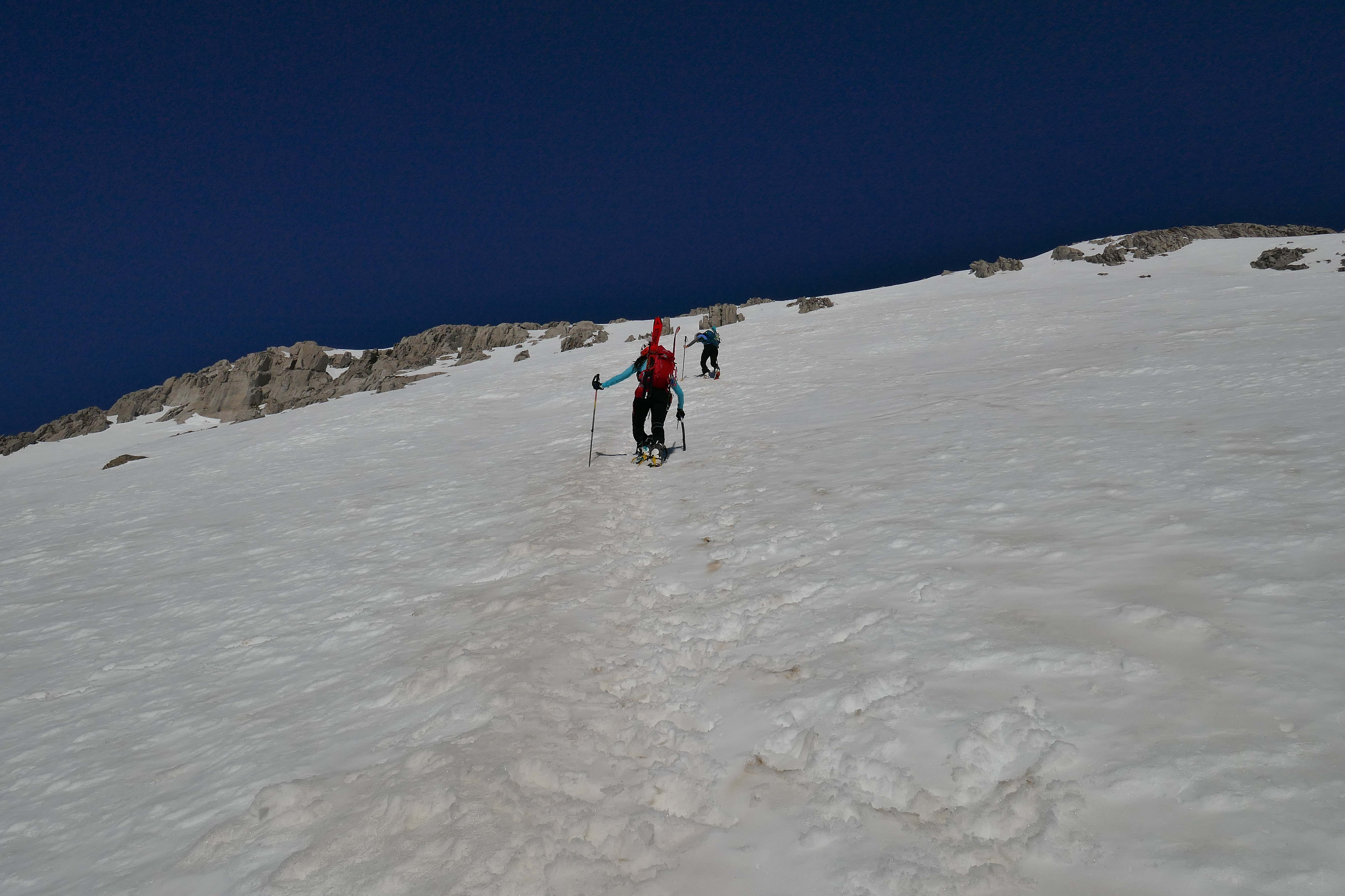 Nos volvemos al piri unos días aprovechando el buen tiempo de la semana, ahora que podemos elegir es una gozada y es mucho más fácil pillar buenas condiciones. Sin tener muy claro si triunfaríamos nos decantamos por el Bisaurín, y fue un acierto, el día anterior había caído una capita de nieve y las temperaturas subieron un montón, sumado a la ausencia de viento y su orientación sur y suroeste, el descenso fue muy bueno desde la misma cima. En nuestro caso para seguir por nieve continua desde que pusimos esquís en lugar de ir al collado del Fortatón, seguimos un poco más por la subida de las fetas y luego giramos a la izquierda directos a mitad pala suroeste. Debido a que el acceso a ese collado era muy expuesto (si te caías te matabas ya que había unos murallones debajo muy grandes) pusimos crampones en ese tramo y ya puestos seguimos hasta la cima con ellos ya que íbamos a progresar más rápido por la ausencia de huella de esquí. Porteo de 30 minutos, con un par de tramos cortos de 3 o 4 metros de hierba esquí.