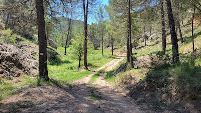 Hoy salgo a hacer una ruta pendiente desde hace tiempo. La original, la 18, es mucho más larga, pero yo con las particiones tengo más que suficiente. Lo que no me esperaba era tanto calor y sufrí mucho...la ruta acaba en subida un buen rato y mi reloj llegó a marcar 38 grados en el manillar. En más de una ocasión me tuve que tirar literalmente a la sombra a recuperar y una fuente en una granja me salvo la vida (justo antes de cruzar la carretera por debajo). Aun así, el agua se calentaba a los 10 minutos, pero conseguí refrigerarme tirándome un botellín de agua encima en la fuente (abrevadero). La ruta es realmente guapa, sendas con flow y disfrutonas, la única pega es lo de terminar en subida que no me gusta nada. Hay sendas para subir y para bajar. En el track me equivoco un rato en una senda ya que estaba el marcaje de la carrera de BTT de Aguaviva del finde anterior (en la que disfrutamos un montón) y cortaba a ruta con un tronco y no lo vi, con lo que me tuve que dar la vuelta en la senda.